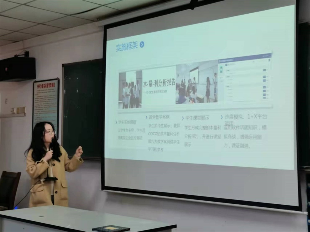 此次参加公开教学的共有六位老师,李佳文老师以《管理会计》课程中企业营运分析内容为例,以学生为主导设计教学过程,学生选择真实企业进行课下调研,利用大数据软件对调研数据进行分析,课堂阶段性展示任务结果,最终要形成完整的营运分析报告,并进行课堂展示,利用所学内容进行企业沙盘模拟经营并在1+X数字化管理会计中级运用。同时,配套专业实训平台,利用沙盘模拟,推进双创融合,利用1+X数字化管理会计平台,实现课证融通。
