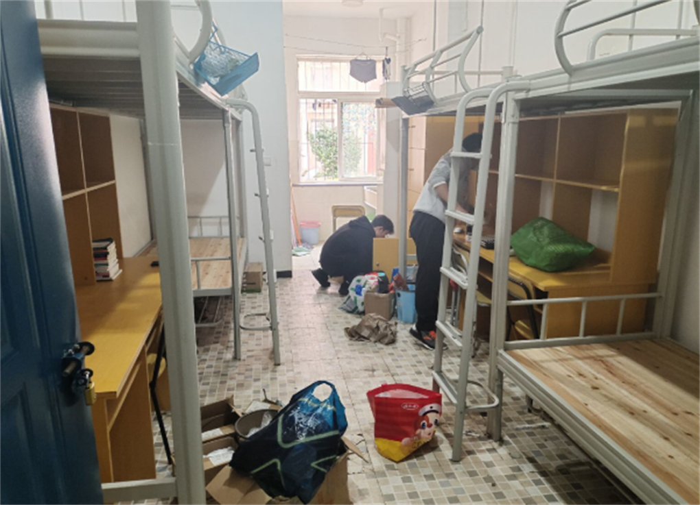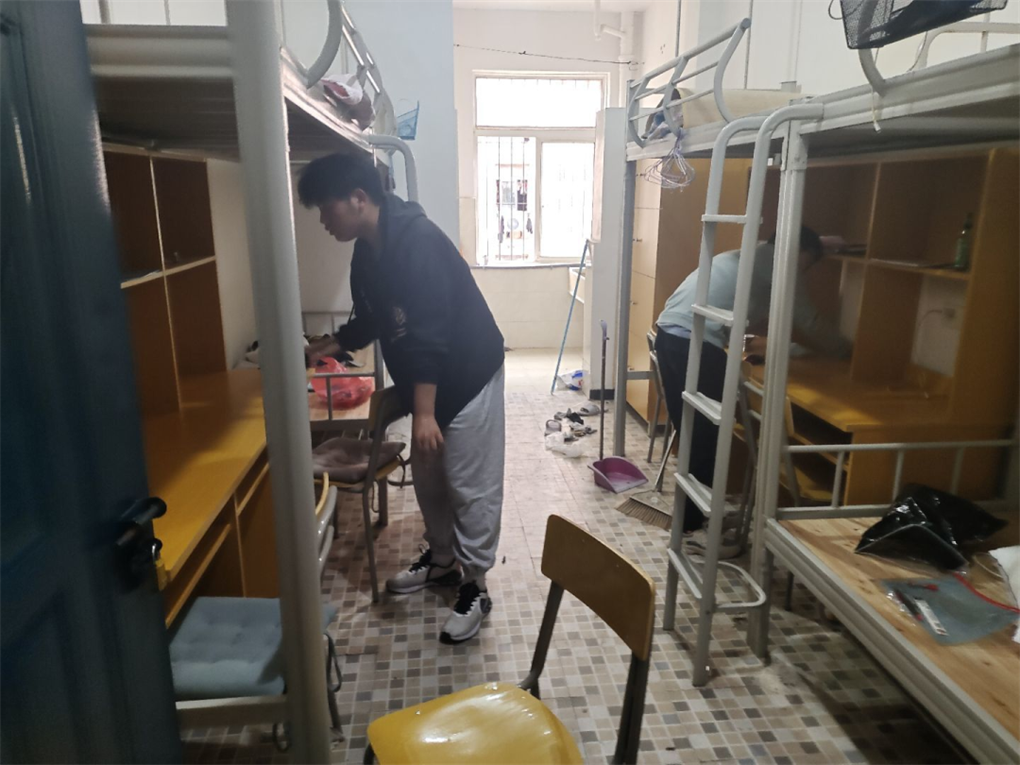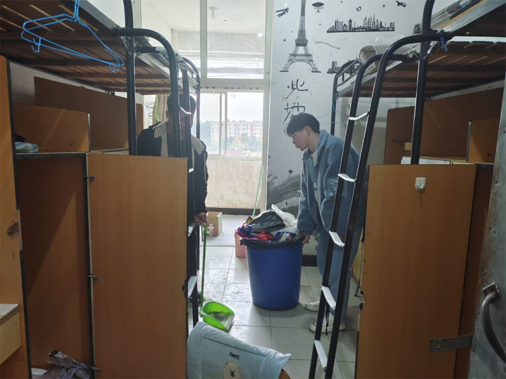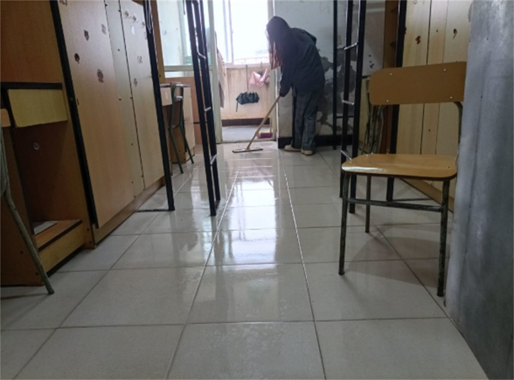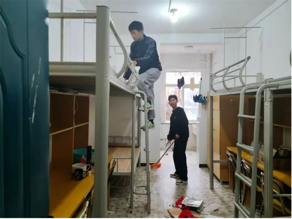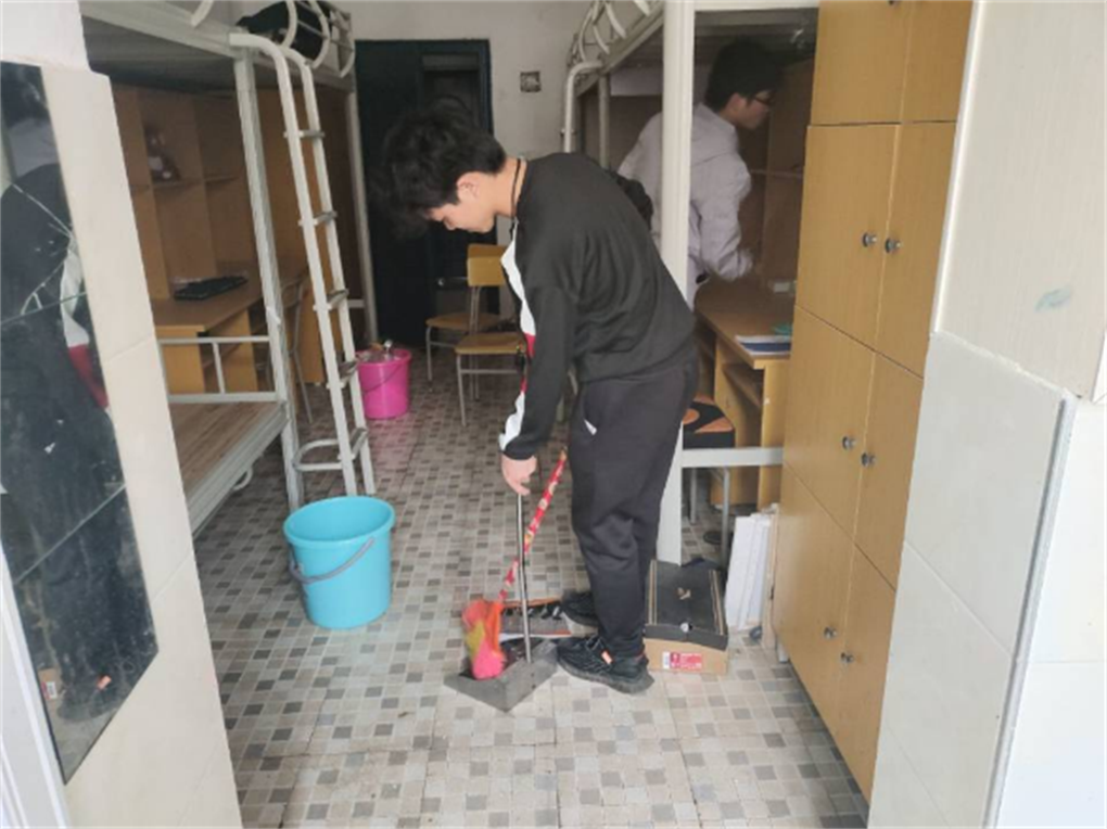 活动期间同学们分工协作,分别拿着扫把、拖把等工具,高效清理。扫地、拖地,擦桌子、清理杂物并将桌椅摆放整齐,对隐藏在各个死角的垃圾和窗户、门框上的灰尘进行全面清扫,确保不留一丝脏物,用实际行动为大家创造一个干净、和谐温馨的宿舍生活环境。
