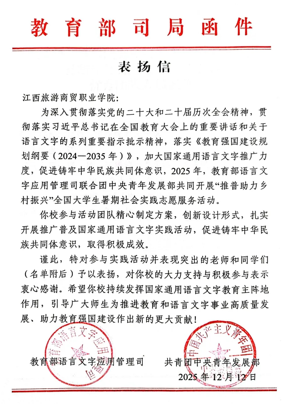 近日,2025年“推普助力乡村振兴”全国大学生暑期社会实践志愿服务活动优秀团队名单正式揭晓!我校“旅商梦”暑期社会实践队从全国2000支团队中脱颖而出,荣获国家级“优秀团队”,教育部语言文字应用管理司、共青团中央青年发展部致信表扬,充分肯定了学校在国家通用语言文字推广普及、助力乡村振兴及铸牢中华民族共同体意识等方面取得的积极成效。