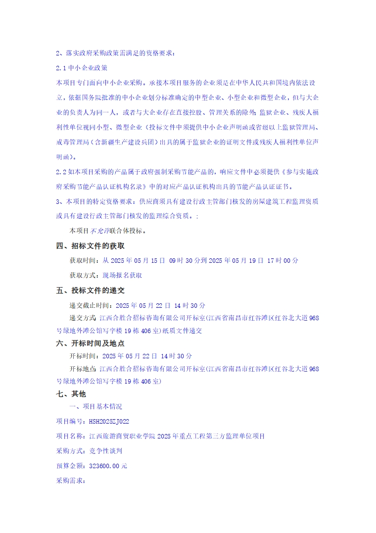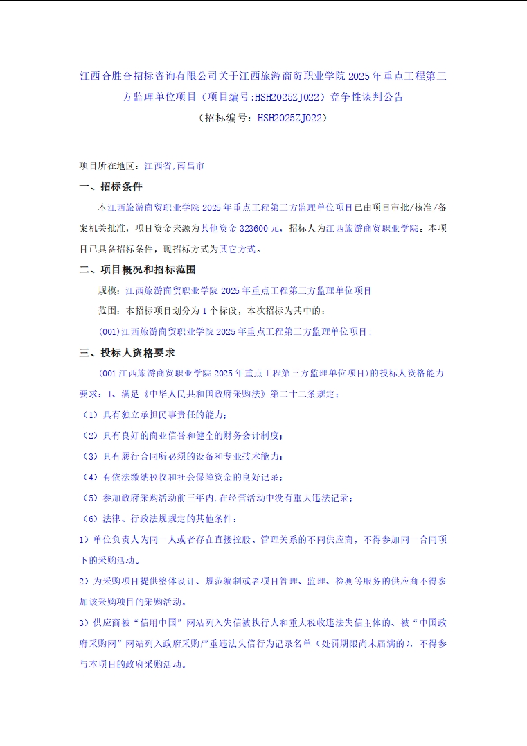 江西合胜合招标咨询有限公司关于江西旅游商贸职业学院 2025 年重点工程第三方监理单位项目(项目编号:HSH2025ZJ022)竞争性谈判公告(招标编号:HSH2025ZJ022)